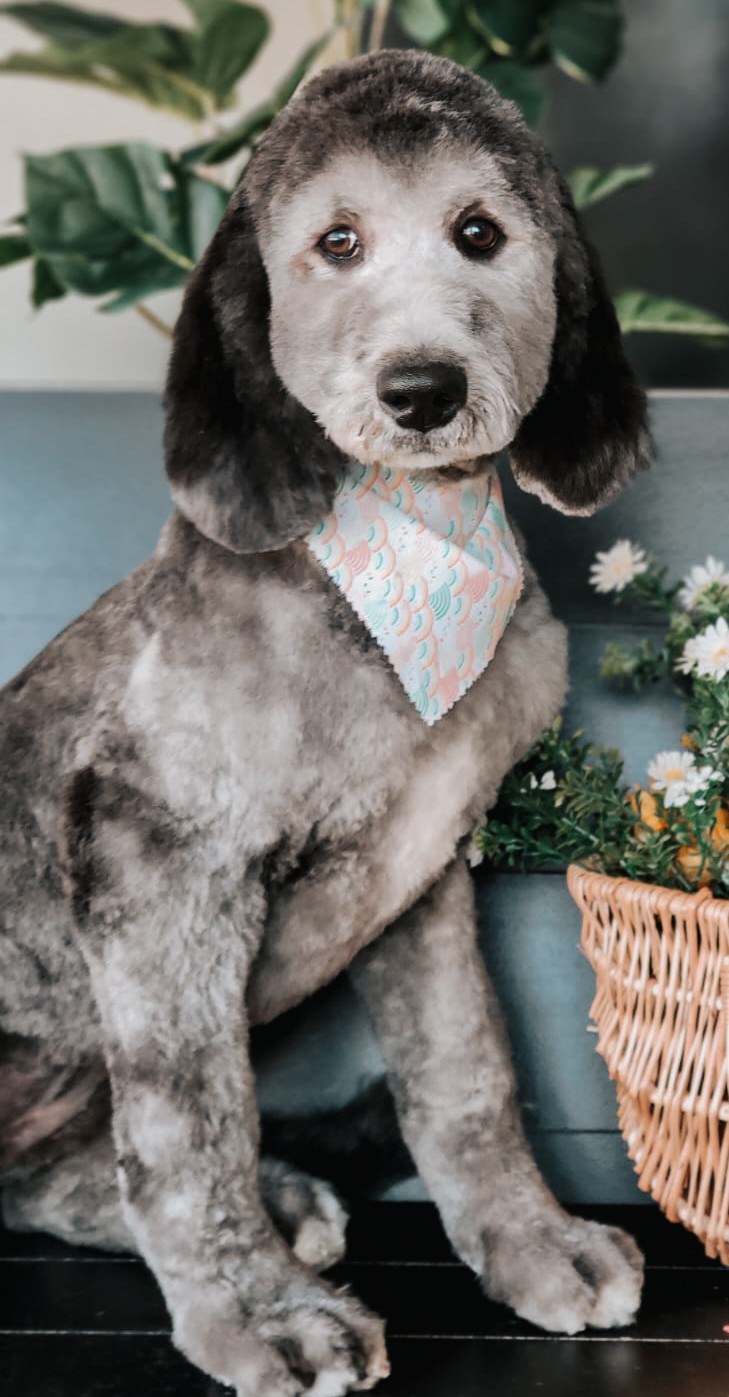 A bath with one of our specialty shampoos and conditioners, blow dry, brush out, ear cleaning, nail trim, paw and pad trim (optional), an all over haircut styled with a rounded, fluffy head and face and a hair length of 0.5″-2″, a spritz of one of our dog colognes and a bandana.